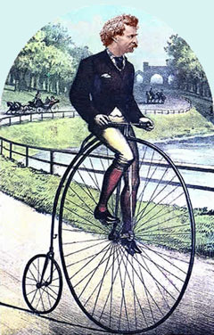 Mark Twain's account of learning to ride a highwheel should be required reading for anyone so inclined . . . (click to view; click again anywhere to hide)