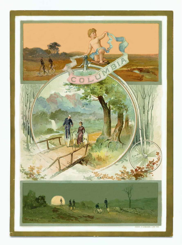 Spectacular and romantic images like these fueled Columbia, America’s first bicycle manufacturer’s rise to fame and helped make the new pastime boom here and around the world in the 1880s and 90s.