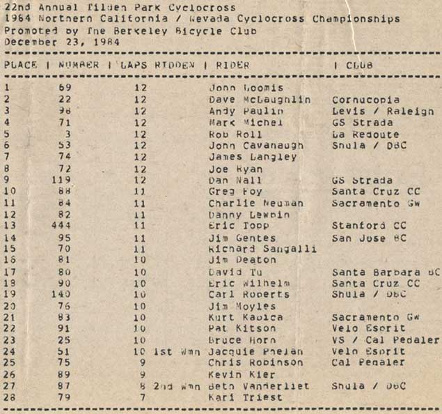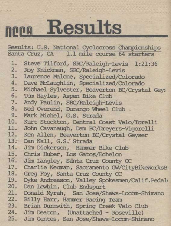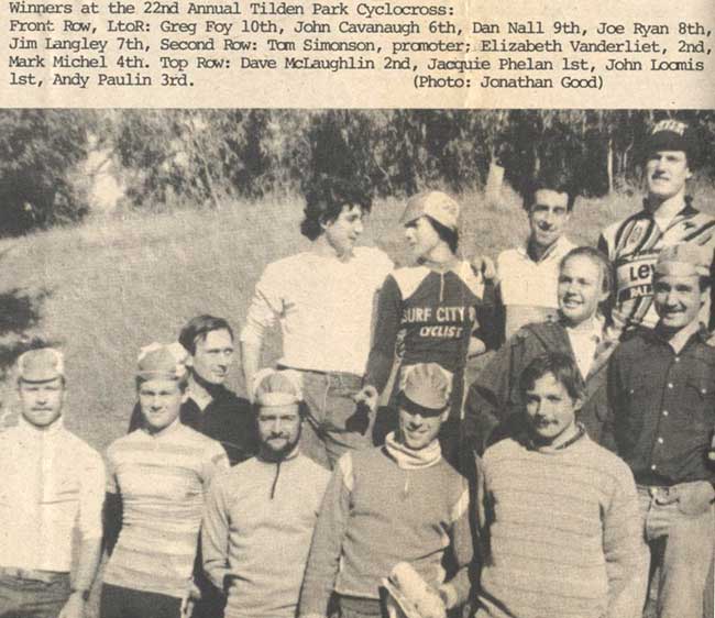 While this was well before the Lance Armstrong era, and I don’t recall Greg LeMond, who did race the road in NorCal, ever crossed it up, there is a possible Tour de France connection: I believe non other than current Versus Tour commentator Bob Roll was a top finisher at some of the Surf City cross races and placed 5th at the 1984 NorCal District Championships. Too bad he didn't make the photo.