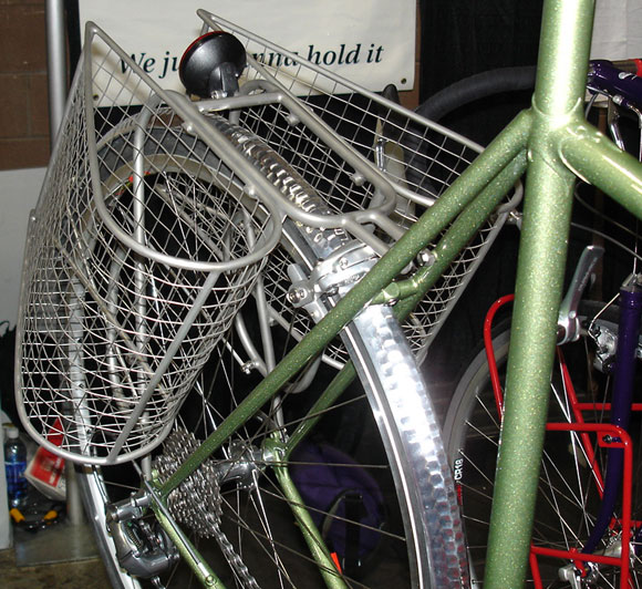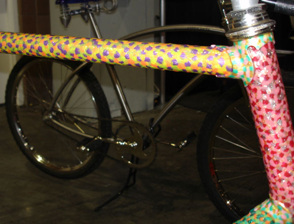 to his Revlon Dream masterpiece. He rounded up a huge supply of nail polish samples and proceeded to paint the complete frame one drop at a time. This took him over 200 hours and makes for a finish you have to see to believe. Great paint will only get you so far if you don’t have the right accessories, so I was delighted to see some new/old accoutrements, such as Brooks’ saddlebags, which are just like the originals we used in the sixties. |