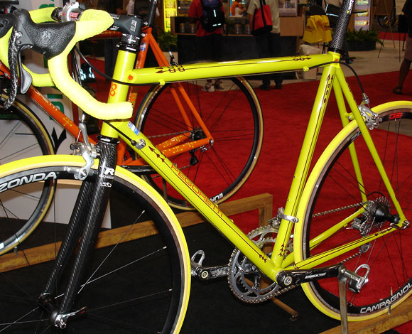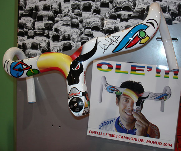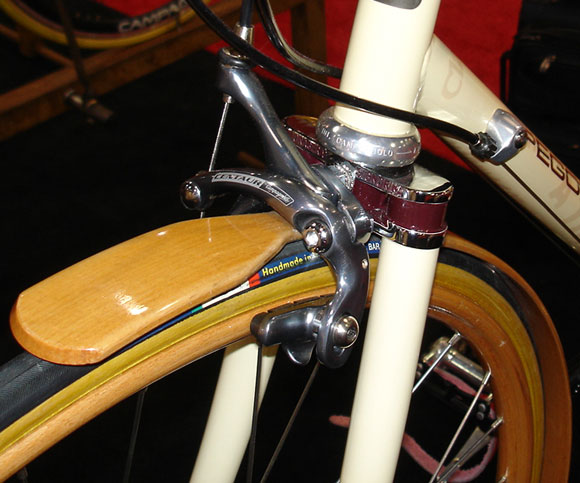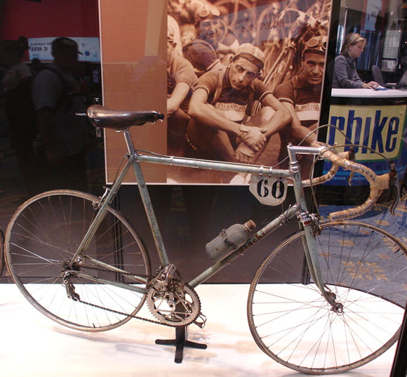of the world. Another special booth was Bianchi’s, but not their main one on the showroom floor — the one they had in the mezzanine you enter before getting inside the show. Here they had several historic bikes in glass cases to commemorate their 125th anniversary. My favorite was the 1954 Tour-winning Fausto Coppi model in as-raced condition (photo), a priceless treasure with a wonderful picture of the Campionissimo who looks like he’s admiring his bike. |