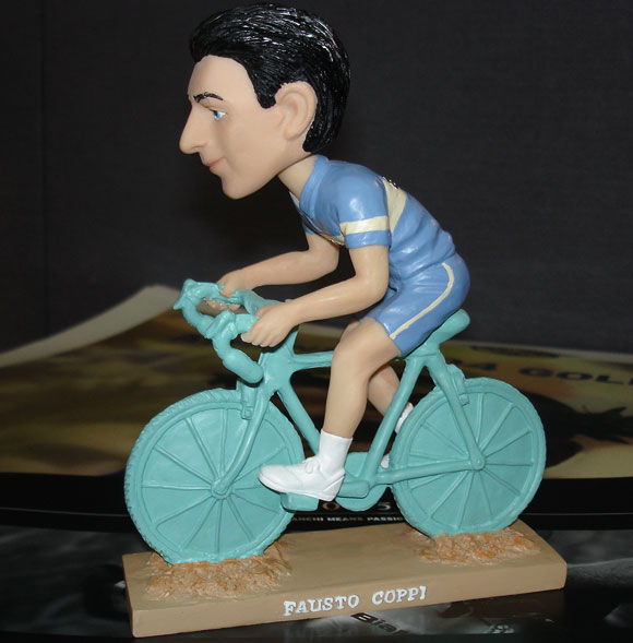 and retro design. Because Bianchi was one of the first to mass produce the bicycle, I thought I’d close with their commemorative Fausto Coppi bobblehead doll, a nice gift for that Italophile in your cycling family. |