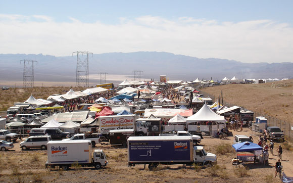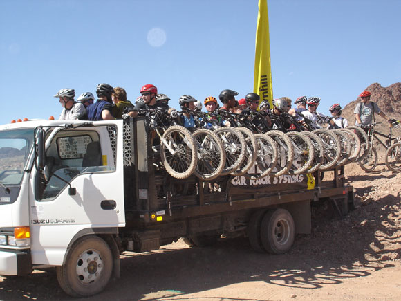 Convention Center filled with bikes and accessories, and 21,000 attendees. For the last several years, Interbike has begun with a couple of days about 30 minutes outside the Strip at Boulder City for the Outdoor Demo (Interbike busses everyone out there), which has become a major reason many folks attend the show. The tent city (photo, below left) has enough booths to keep you busy studying the latest and greatest for the full 2 days. But, the real fun is in trying the different bikes. This year, they had nicely designed courses including a surprisingly exciting singletrack, a wonderfully smooth and car-free pavement stretch and a downhill course and BMX track. Mavic was buzzing around on support motorcycles loaded with spare wheels to fix flats. Interbike even offers a taxi service, at least for getting to the downhill course (photo). I took the chance to try Giant's new Advance carbon-fiber wonderbike (the frame weighs 1.9 pounds!). It's the same full-Dura-Ace thoroughbred raced by T-Mobile this season (it rode fantastically). Then I hopped on a Salsa dualie to check out the trails everyone was raving about. |