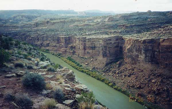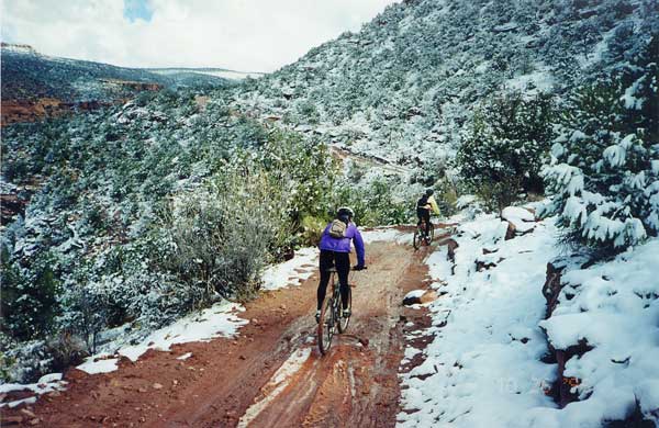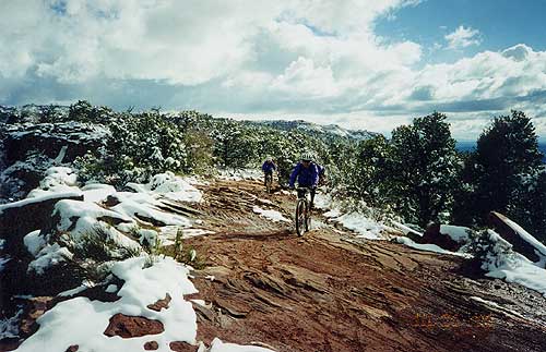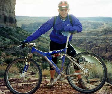 The Porcupine Rim Trail is one of the more famous mountain bike rides in Moab, Utah and one of my favorite off-road rides ever. Starting from Moab as we did, it's about a 34-mile loop. Or you can get shuttled to the trailhead and avoid the first 10 uphill miles. We (a group of Bicycling Magazine editors) were in Moab in September, 1996 to test full-suspension mountain bikes on the trails, and racing bikes on Moab's equally phenomenal road loops. Here are a few pictures I managed to get before dropping and breaking my camera. Tip: Porcupine Rim Trail is technical with rocks and drop-offs galore and high speeds. Once you reach the top, it's a long, thrilling descent, but you need good skills and good luck. One of our party got crossed up not far from the top of the trail, fell and broke his wrist (he got back safely). If you ride the trail, stay safe and keep it fun.